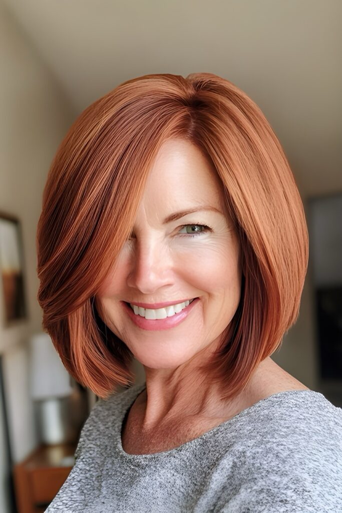 The A-line bob is a sophisticated option that features a longer front and shorter back. This hairstyle is incredibly flattering and creates a polished look. It works well for both straight and wavy hair, making it a versatile choice for mature ladies.