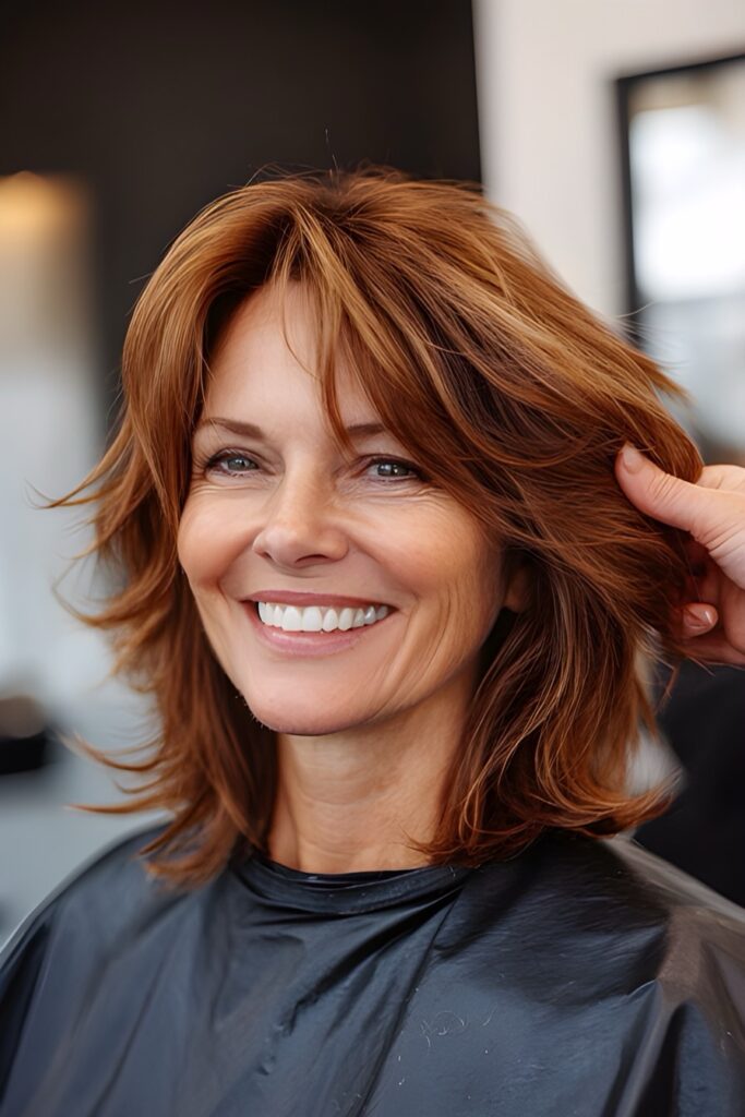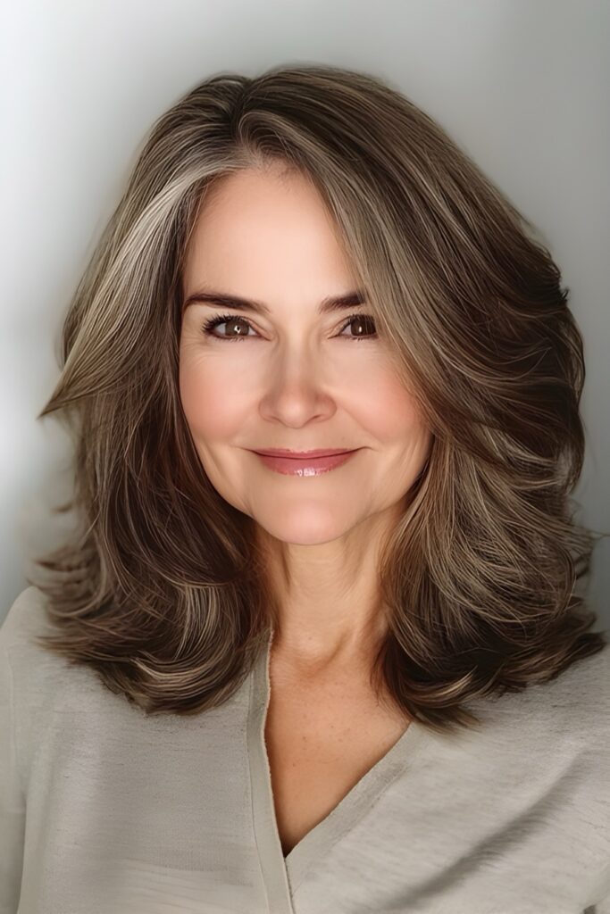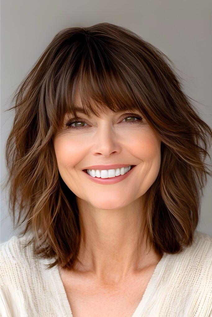 For women who prefer keeping some length, mid-length hair (just past the shoulders) with strategic layers is a fantastic option. Face-framing pieces brighten the complexion, while longer layers maintain a youthful flow.