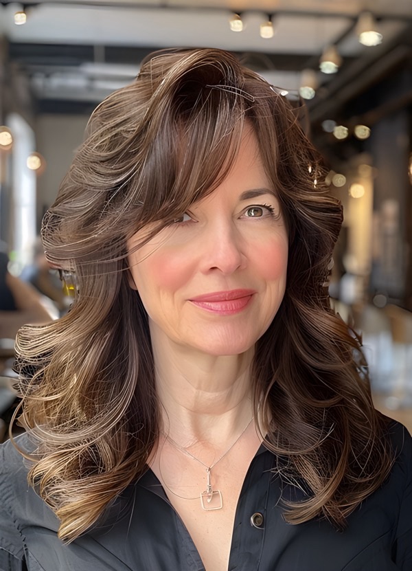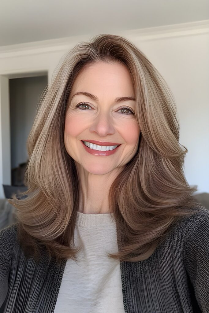 Long hair doesn’t have to age you—if it’s cut correctly. Long layers with face-framing pieces soften the jawline and add movement, preventing hair from looking flat or lifeless.