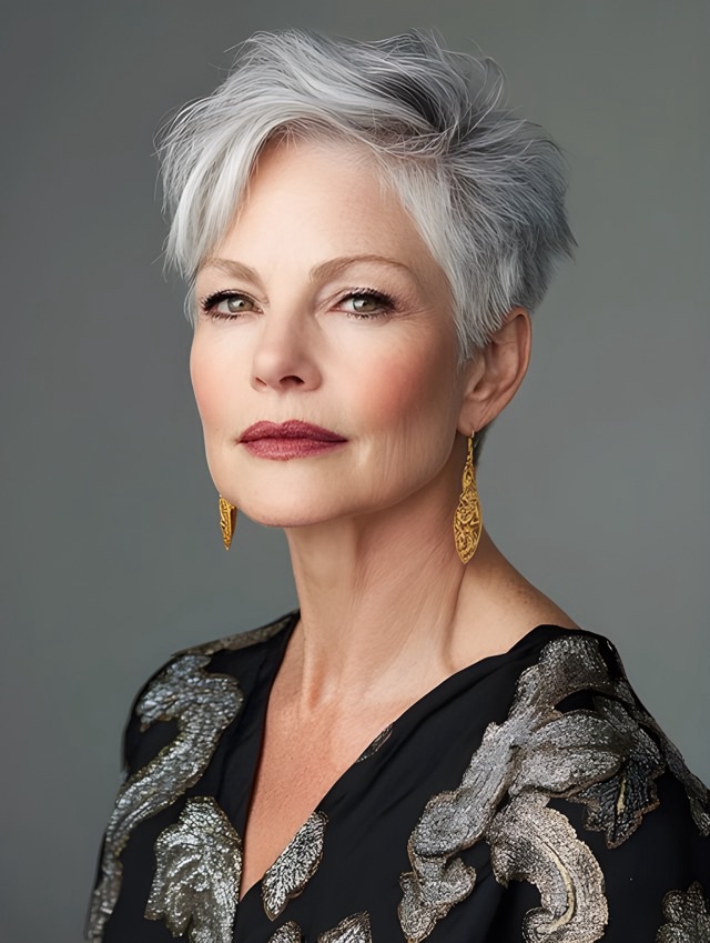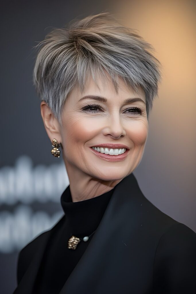 Embracing natural gray or silver hair? A pixie cut can showcase your gorgeous color with minimal effort. Opt for a platinum pixie with subtle highlights or a sleek silver crop for a high-fashion finish.