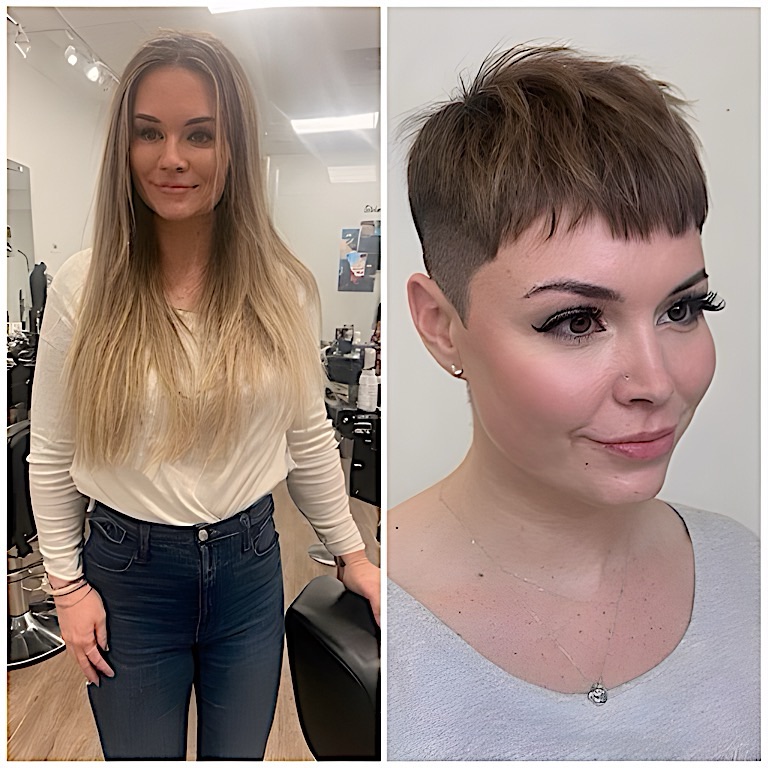 After: A textured pixie with side-swept bangs draws attention to the eyes and cheekbones, creating a sleek, modern look. For those with thinning hair, a slightly longer top with tapered sides adds fullness where needed.