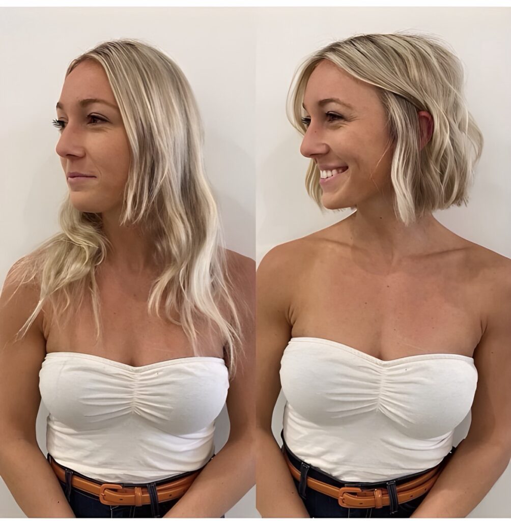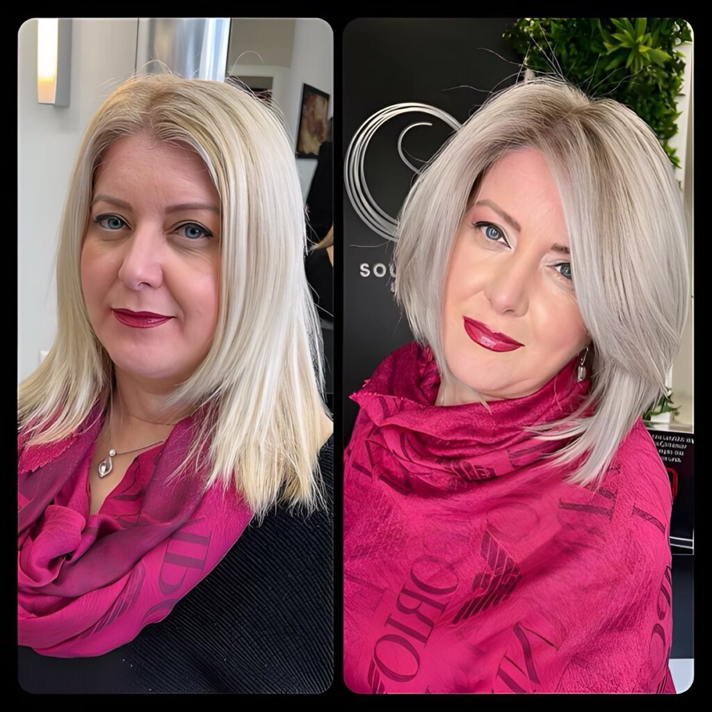 After: Transitioning to silver or white hair can be breathtaking. A skilled stylist can blend grown-out color with highlights or a full transition to an icy blonde or platinum tone. A sleek, angled bob or soft waves showcases silver hair’s natural shine.
