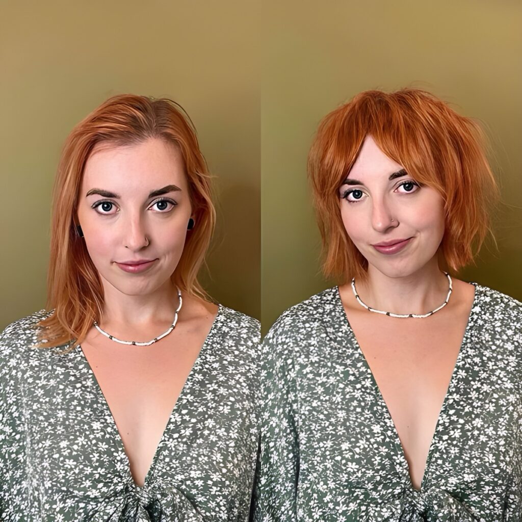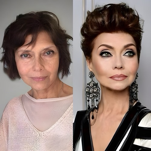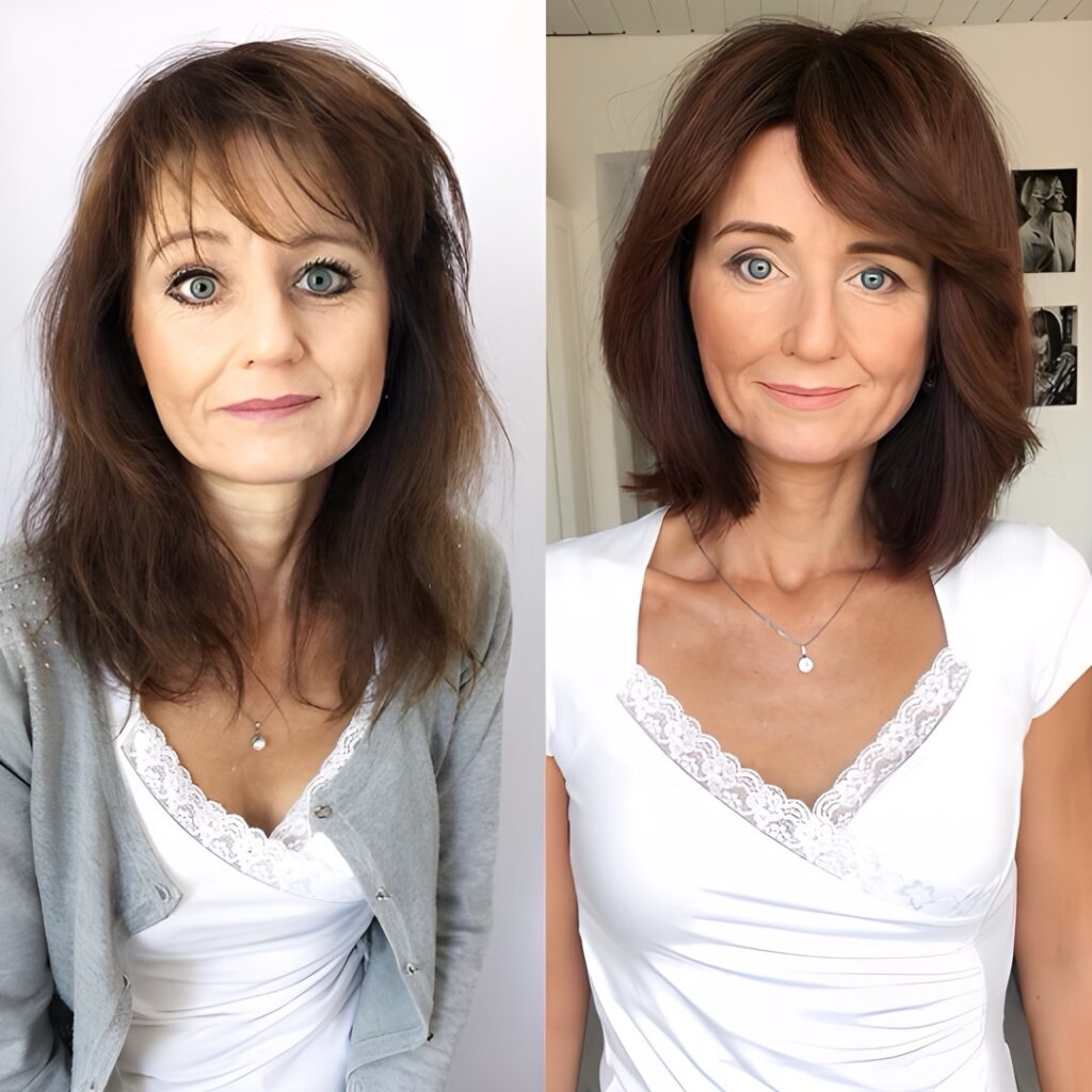 After: A chin-length bob with subtle underlayers lifts the jawline, making the neck appear longer and more elegant. Adding side-swept bangs softens forehead lines, while a slightly asymmetrical cut adds modernity.