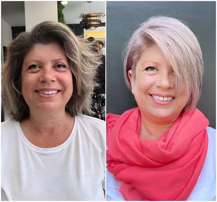 Before: Many women spend years covering grays, only to find the upkeep exhausting. Grown-out roots and harsh dye lines can actually age you more than natural silver.