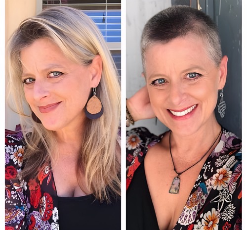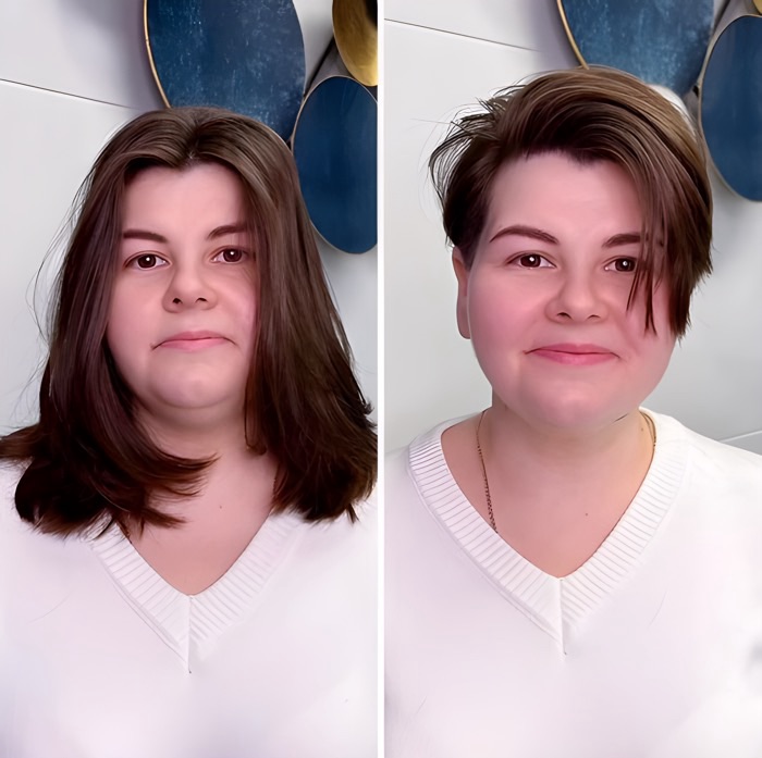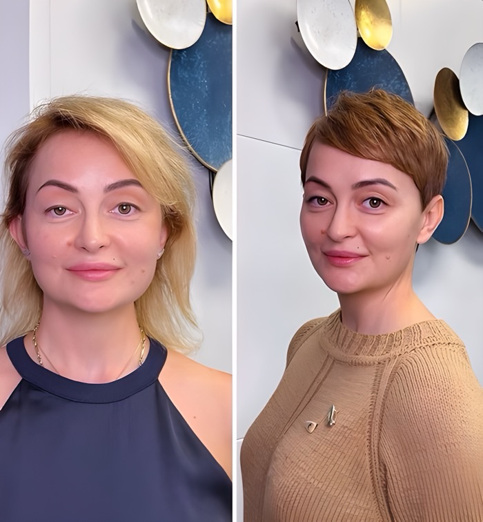 After: A textured pixie with side-swept bangs draws attention to the eyes and cheekbones, creating a sleek, modern look. For those with thinning hair, a slightly longer top with tapered sides adds fullness where needed.